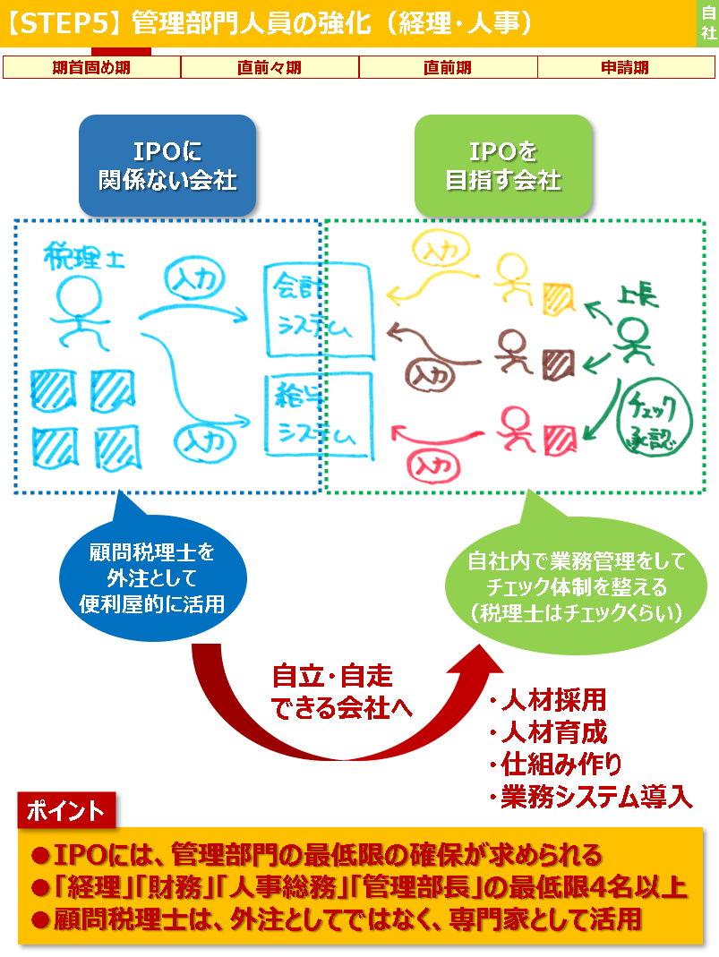 […] 3】 税理士依存からの脱却 【STEP 4】 税務会計から上場会計へ 【STEP 5】 管理部門人員の強化(経理・人事) 【STEP 6】 労務管理体制の強化 【STEP 7】 […]