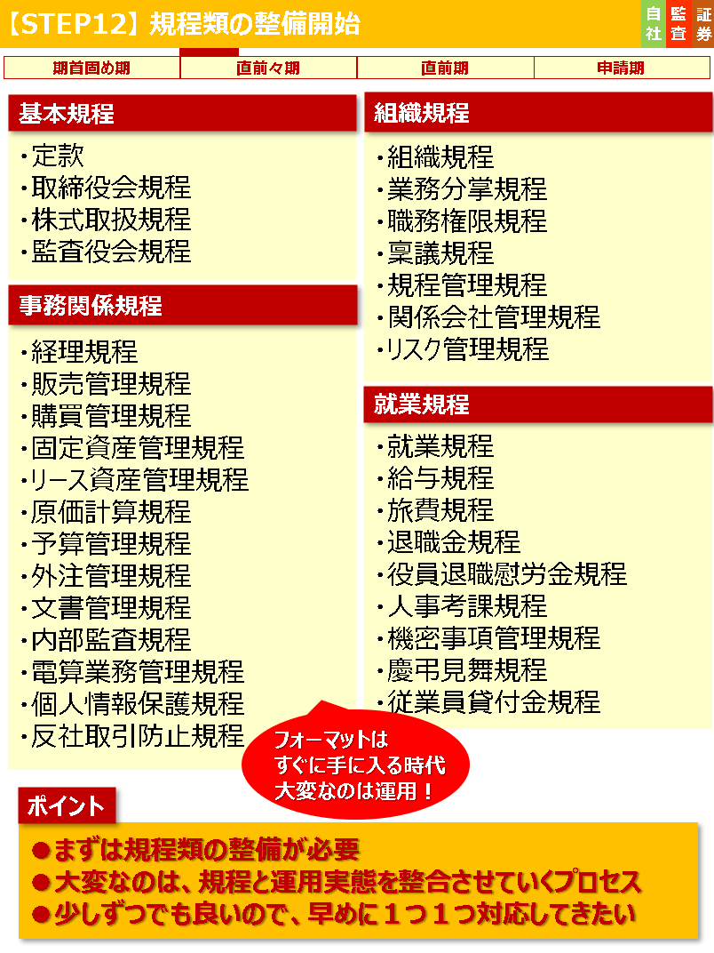 […] 【STEP10】 関連当事者の整理 【STEP11】 上場PJチーム発足 【STEP12】 規程類の整備開始 【STEP13】 月次決算の早期化 【STEP14】 […]