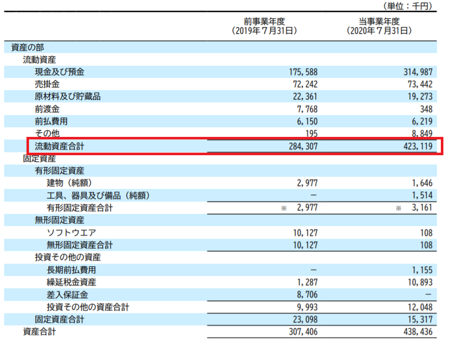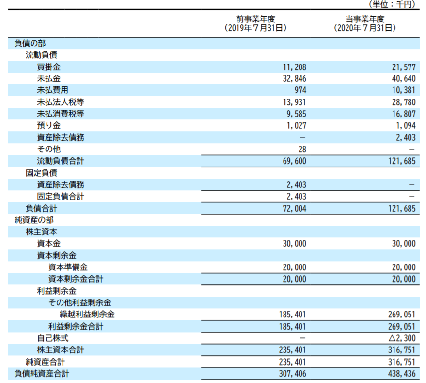 ・直近の決算(2020年7月期)における純資産比率は、