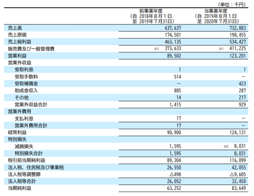 ・直近の決算(2020年7月期)の売上総利益率が73%程度と、とても高水準です