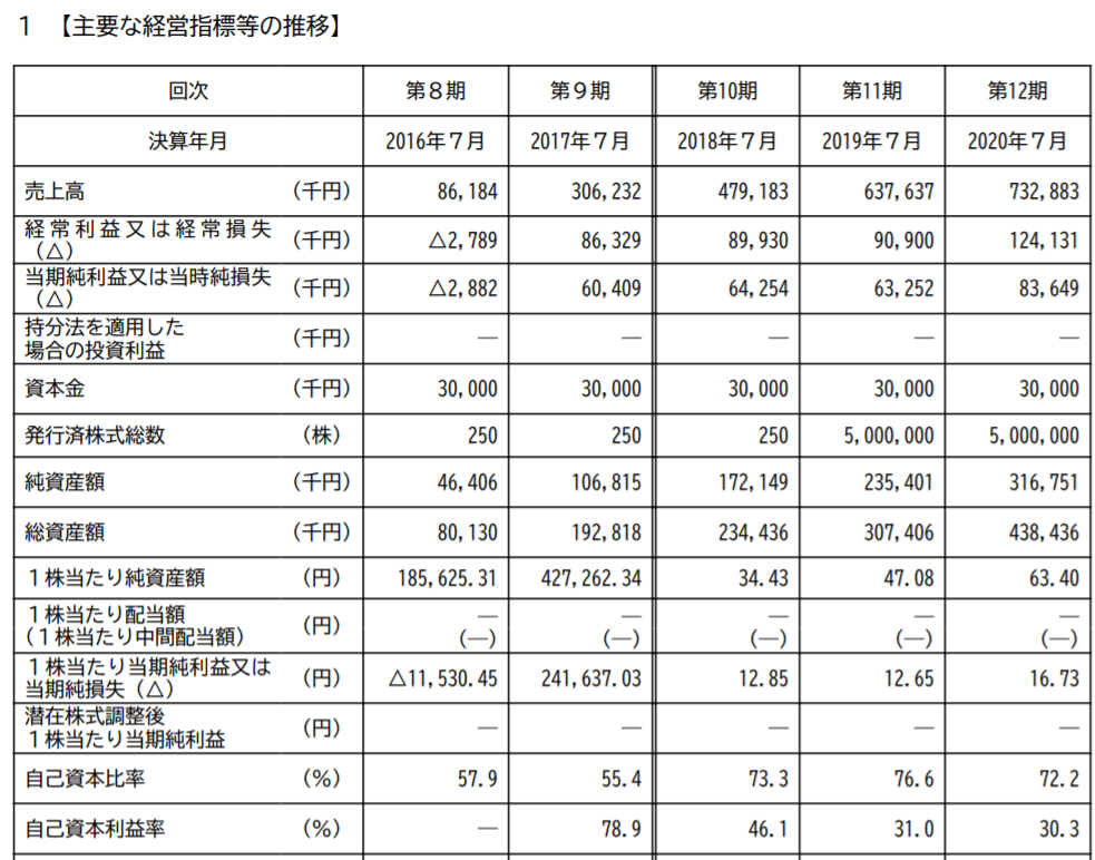 ・直近の決算(2020年7月期)の売上高は732百万円と