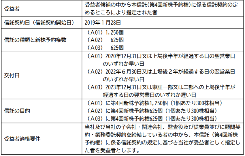 に第4回新株予約権(2019年1月28日臨時株主総会決議)を発行しております。本信託は、当社の役職員等に対して、将来の功績に応じて、