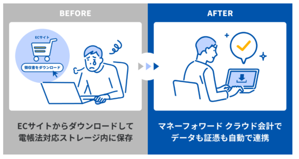 証憑を電子で保管することが求められます。そのため、ECサイト等で取得した領収書や請求書の証憑データを