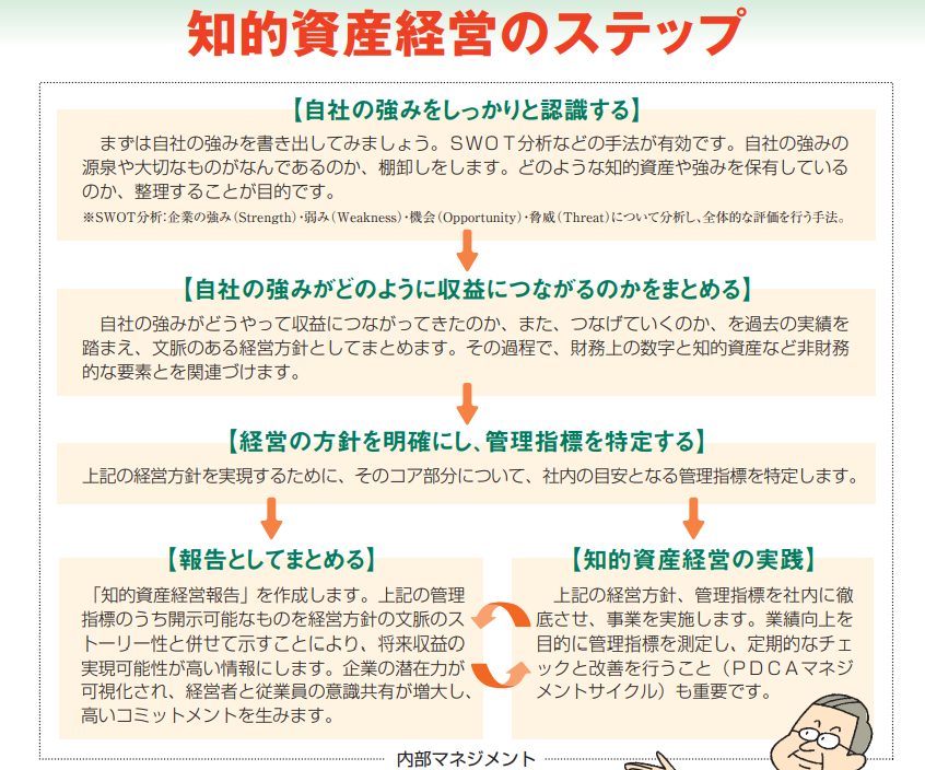 知的資産経営とは、自社が持つ知的資産をしっかり認識し、それを積極的に活用して業績アップや企業価値向上につなげる経営手法です。日本政府(経済産業省)も「知的資産経営ポータル」というサイトを運営するなど、中小企業にこの手法を推奨しています。