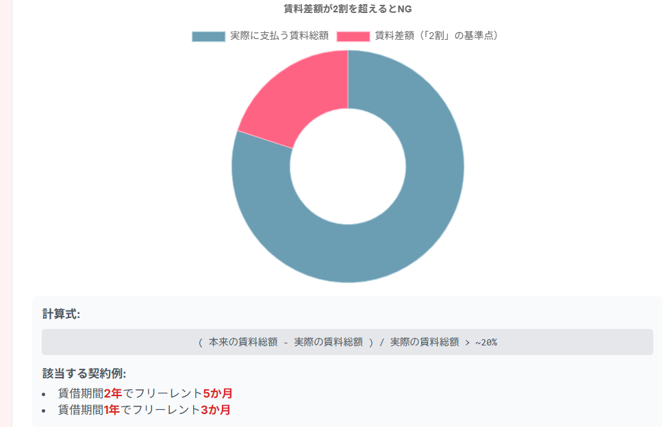 これは、フリーレントがない場合の賃料総額(本来の賃料×賃借期間)と、実際の契約で支払う賃料総額との差額が、実際の賃料総額の「おおむね2割」を超える場合に該当する、という基準です。