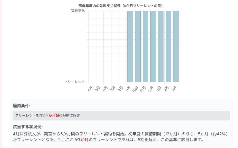 これは、フリーレント期間が含まれる事業年度において、その事業年度の賃借期間の「おおむね5割を超える期間」が「賃料の支払がない、または通常に比して少額である」と見込まれる場合に該当します。